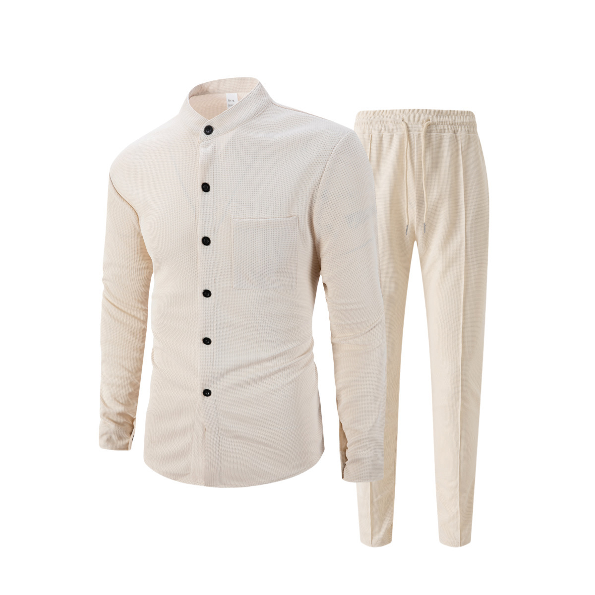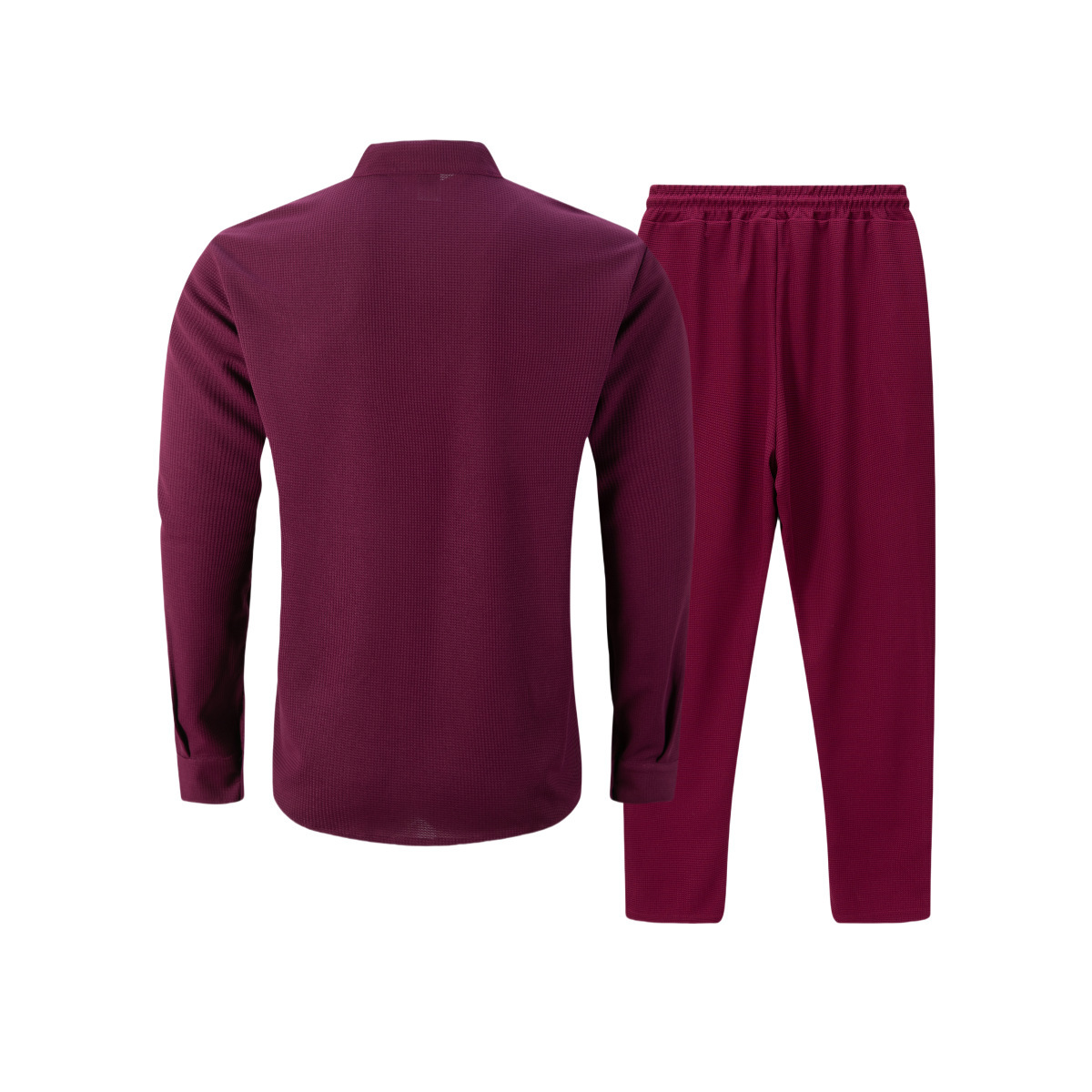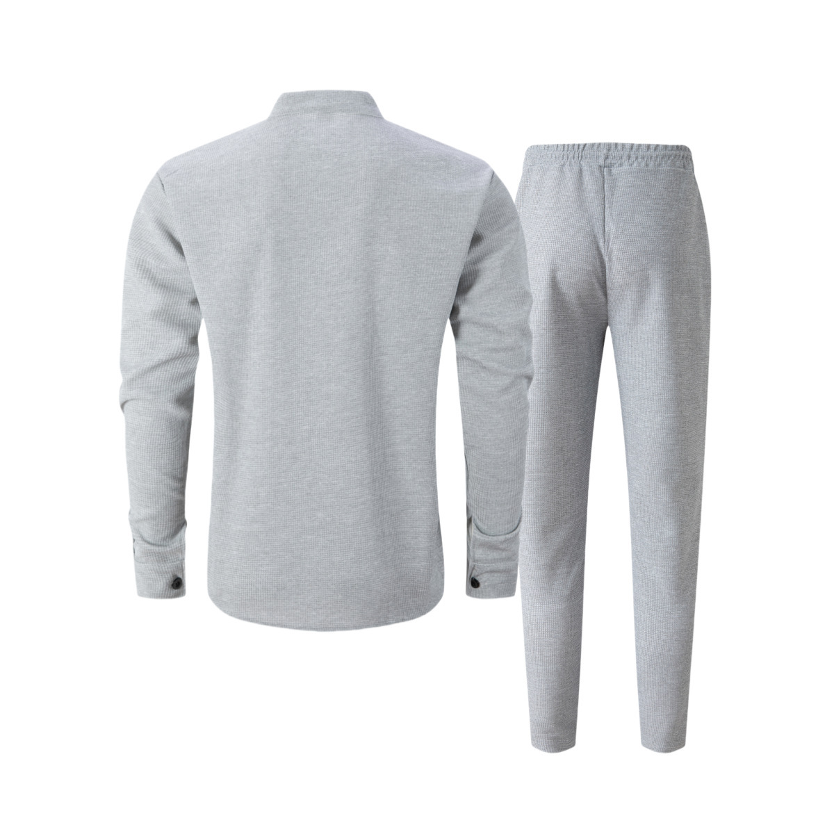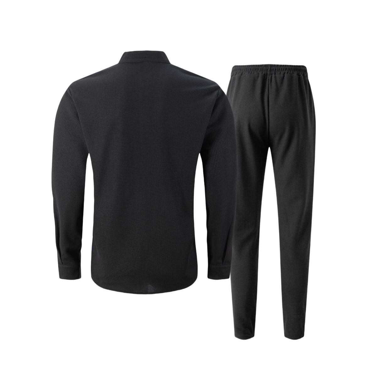 Waffle-textured Solid-color Stand-collar Shirt And Long-sleeve Pants Casual Set